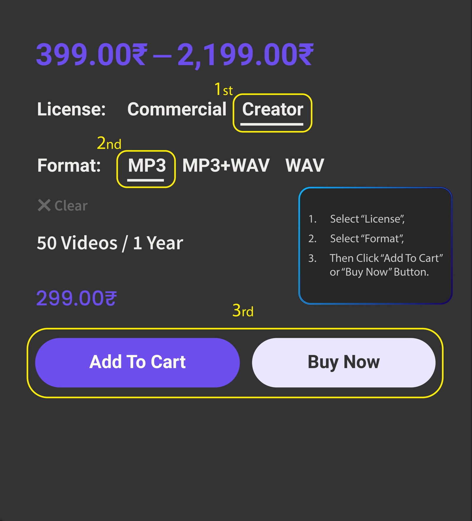 1. Select License: First, choose the license type suited for your needs (e.g., 'Commercial' or 'Creator').